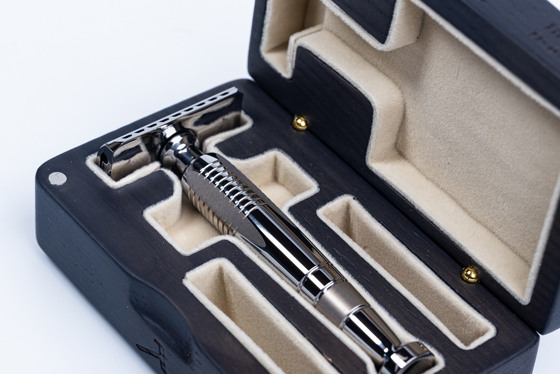 The presentation is already familiar to me from my previous bronze Lambda Athena, a mahogany box with bronze hinges, and here the color is dark gray - graphite. A very stylish luxury performance. Absolutely the best razor presentation I've ever seen.